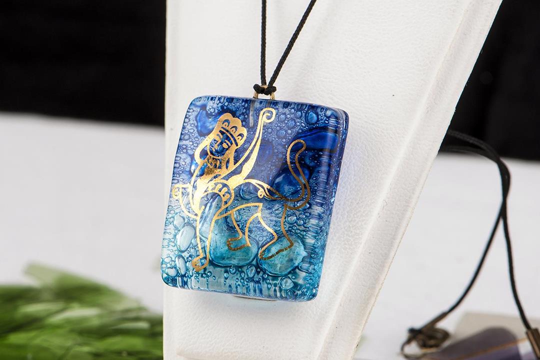 Cam füzyon mavi-turkuaz bouble Anadolu medeniyeti kolye. %10 altın içerir