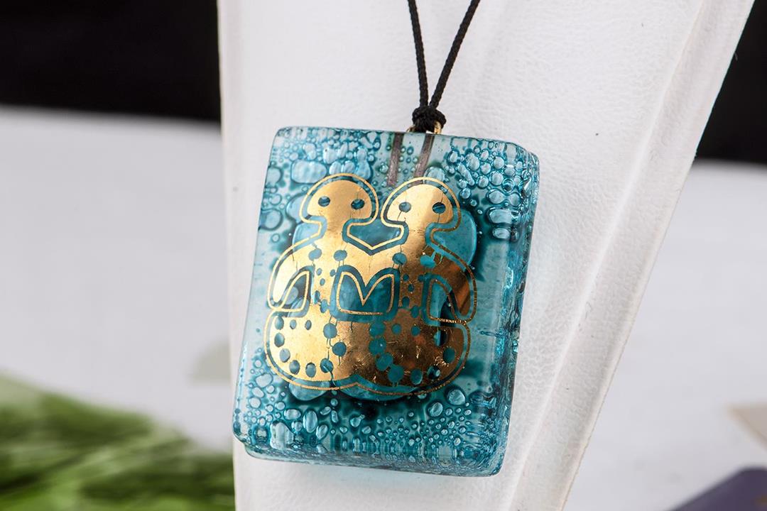 Cam füzyon turkuaz bouble Anadolu medeniyeti kolye. %10 altın içerir