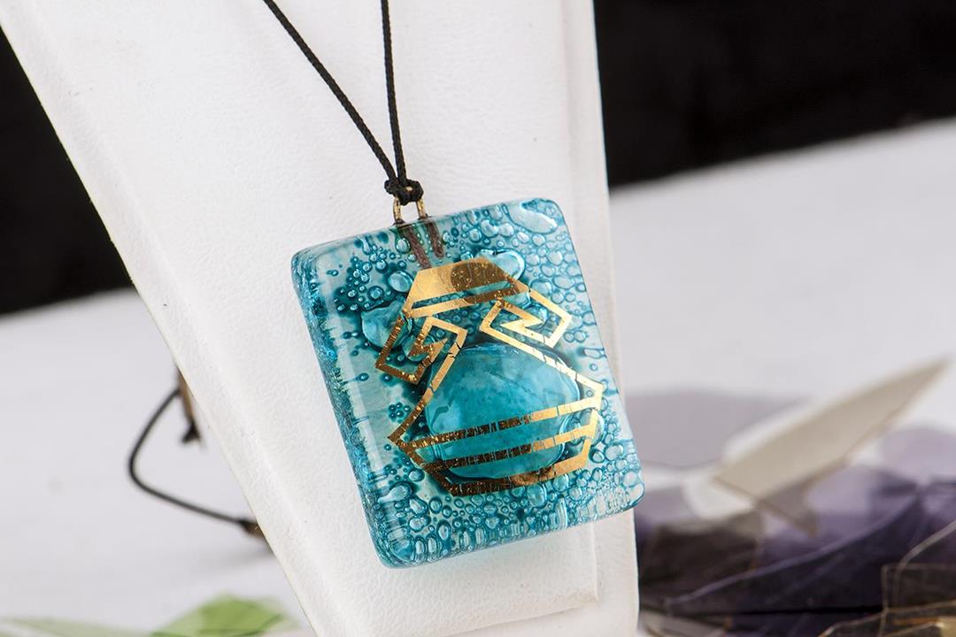 Cam füzyon turkuaz bouble Anadolu medeniyeti kolye. %10 altın içerir