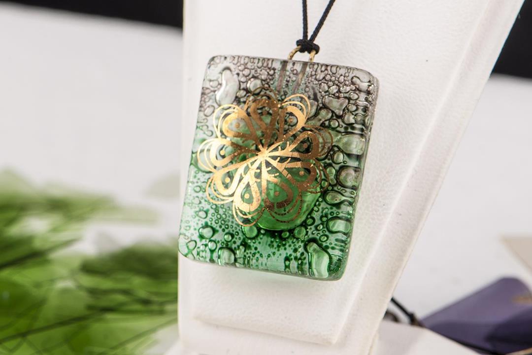 Cam füzyon yeşil-gri bouble Anadolu medeniyeti kolye. %10 altın içerir