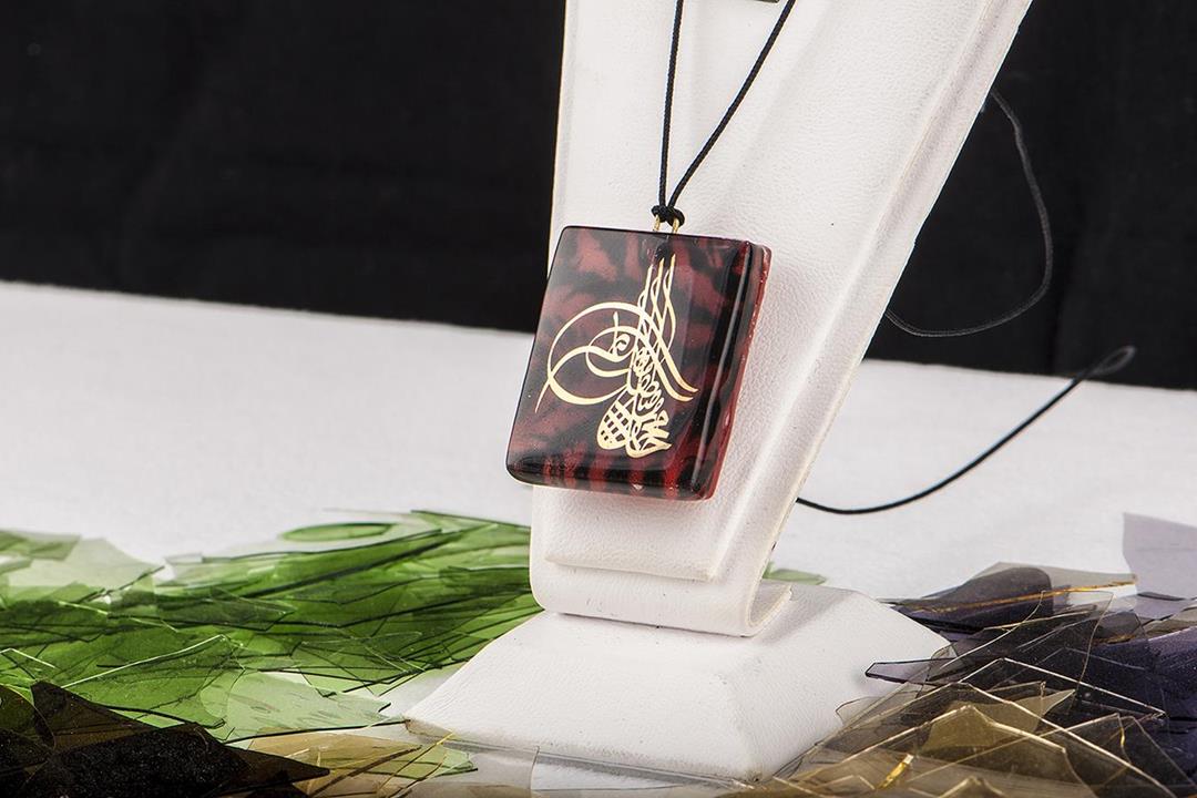 Cam füzyon kırmızı tuğra kolye. %10 altın içerir.