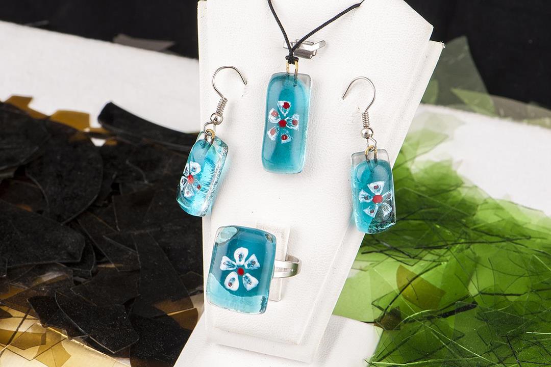 Cam füzyon küpe kolye yüzük seti.