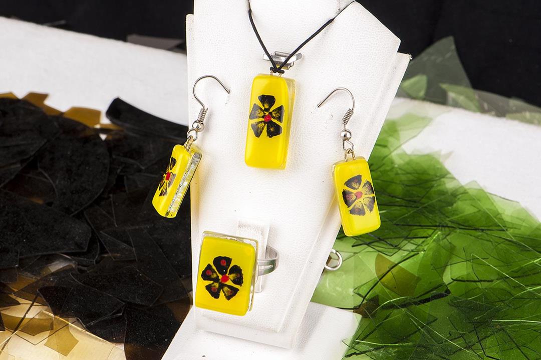 Cam füzyon küpe kolye yüzük seti.